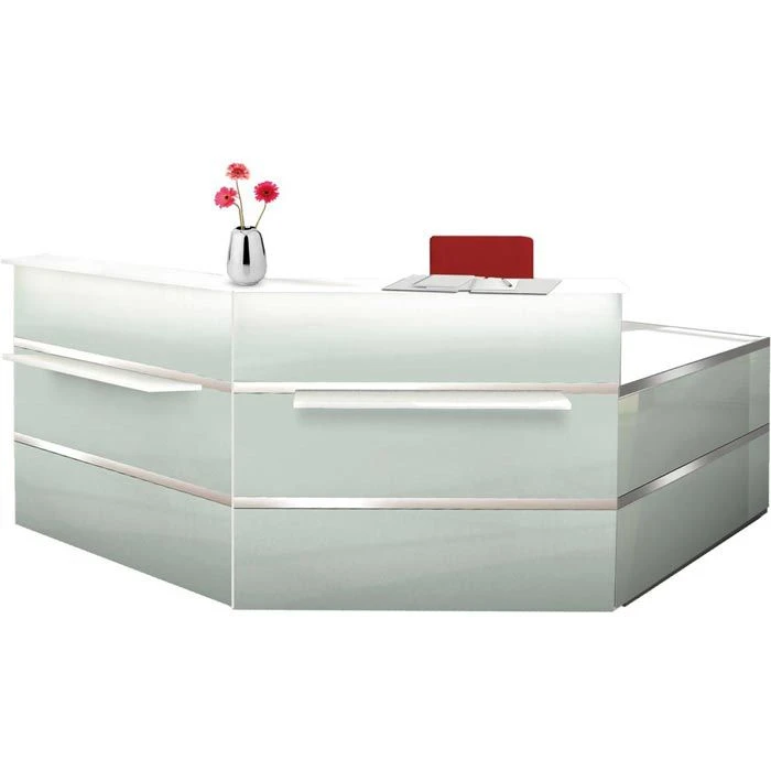 sonstiges: Theke bestehend aus 2 Thekenelementen, einem Anbautisch, zwei Taschenablagen und zwei Seitenblenden, Arbeitsplatte 75 cm hoch mit drei 60 mm Kabeldurchlassdosen, melaminharzbeschichtete E1-Qualitäts-Spanplatte, 2 mm starke ABS-Kanten, Arbeitsplatte, Ablageplatte und Seitenblenden 19 mm stark, Front mit zwei 20 mm hohen Edelstahlstreifen, Front- und Seitenblenden mit 4 mm starkem Einscheibensicherheitsglas, rückseitig weiß lackiert, Metallteile pulverbeschichtet