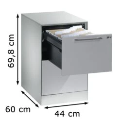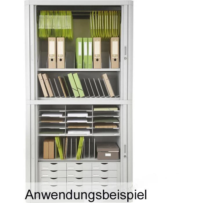Der Aktenschrank besteht aus Kunststoff und Metall und ist ausgestattet mit Rollladentüren mit integrierter, verdeckbarer Grifföffnung, die auch bei engen Platzverhältnissen problemlos geöffnet werden können und sich komplett, für optimale Einsicht, in die Seitenteile schieben lassen. Die Rollladentüren verhindern eine ungewollte Einsicht fremder Personen in Ihre Akten.