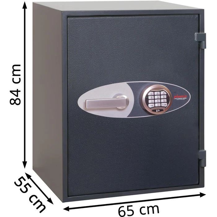 sonstiges: Feuerschutz-Zertifikat nach EN15659 ECB.S LFS30P, Versicherungsschutz bis 65.000,-€ (privat) bzw. 20.000,-€ (gewerblich) möglich, elektronisches Hochsicherheitsschloss der VdS-Schlossklasse 1, dreiseitige Verriegelung durch 24 mm starke Riegelbolzen, doppelwandige Konstruktion, gefüllt mit hoch widerstandsfähigen Verbundmaterialien, verstärkt durch Bohrschutzplatten und Notverriegelungsmechanismen in der Tür, Türöffnungswinkel 180° durch außenliegende Bänder, herausnehmbarer Fachboden, geeignet für die Aufbewahrung von Dokumenten aus Papier und Wertgegenständen, sowie Speichermedien, zugelassen als Betäubungsmittel-Tresor und für die Aufbewahrung von Handfeuerwaffen