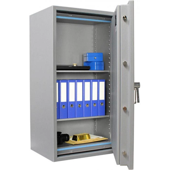 sonstiges: Feuerschutz-Zertifizierung für Dokumente gemäß EN 1047-1 S60P, Versicherungsschutz möglich bis: 20.000 € (gewerblich) / 65.000 € (privat), aufbohrgeschütztes Schloss, vierseitige Verriegelung mit 12 Bolzen, Türöffnungswinkel 180° durch außenliegende Scharniere, Türstärke 110 mm, Drehgriff, Fachböden verstellbar, eine Bohrung im Boden (16 mm) zur sicheren Verankerung, glanzverchromter Beschlag, entspricht §36 des Deutschen Waffengesetzes, geeignet für die feuersichere Aufbewahrung von Dokumenten aus Papier und Wertgegenständen