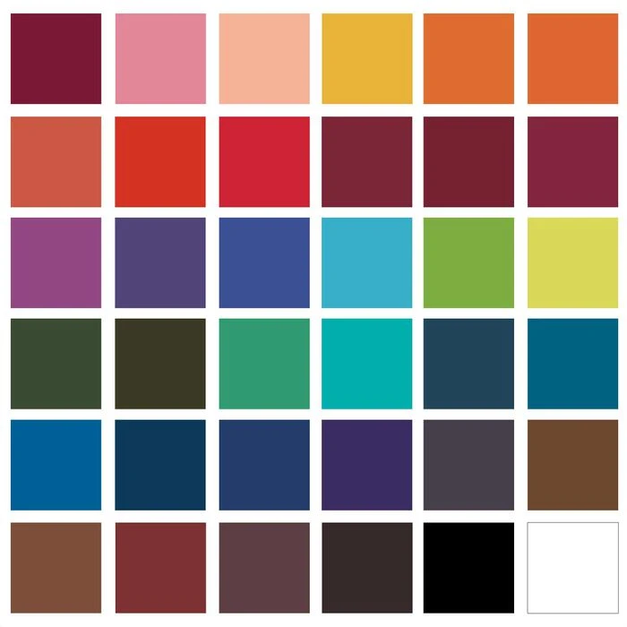 Farbvarianten: titanweiß, zitronengelb, neutralgelb, indischgelb, indischgelb dunkel, orange, orangerot, karminrot, permanentrot dunkel, karminrot dunkel, purpur, krapprosa, krapprosa hell, fleischorange, violett hell, blauviolett, dunkelviolett, preußischblau, ultramarinblau, azurblau dunkel, colinblau, azurblau grünlich, türkis mittel, chromoxidgrün imit., chromoxidgrün opaque, chromoxidgrün st. dkl., deckgrün opaque, maigrün, olivgrün, ocker dunkel, gebr. umbra, gebr. umbra rötlich, bister, englischrot dunkel, grau 4K, neutralschwarz