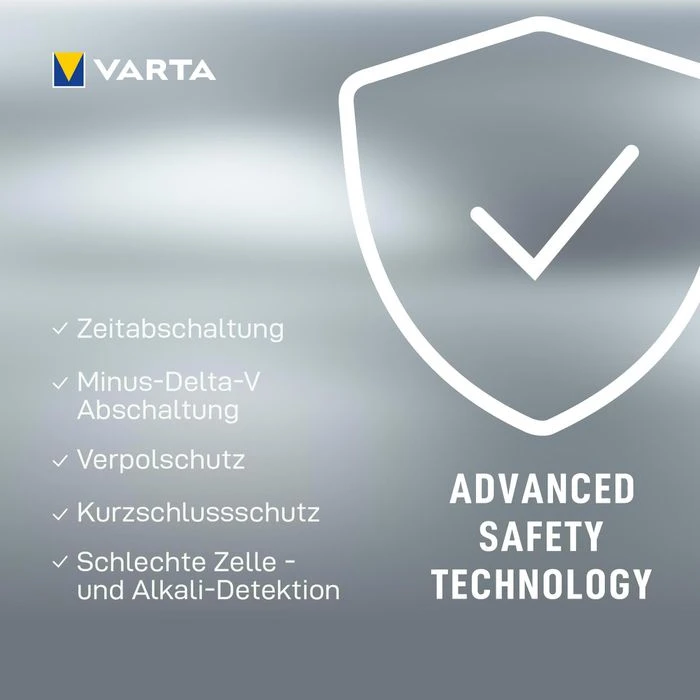 Schutzsysteme: Überladeschutz (-dU), Sicherheitstimer, Kurzschlussschutz, Akku-Defekt- und Alkaline-Erkennung