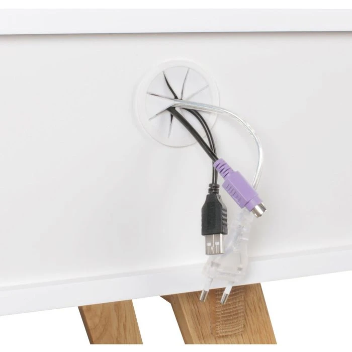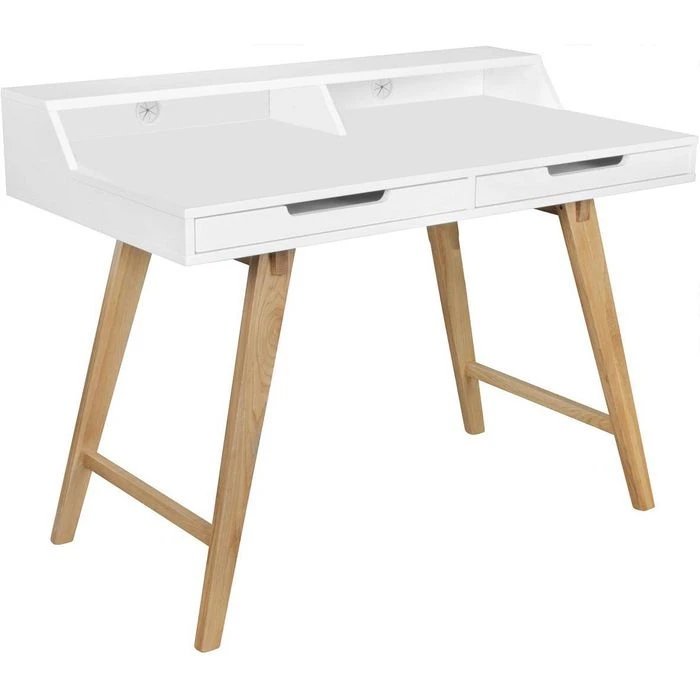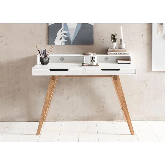 sonstiges: Tischbeine aus Eiche Massivholz, zusätzlicher Stauraum durch 2 Schubfächer und Regalfächer, Kabeldurchlässe in Rückwand der Regalfächer, MDF-Platte mit pflegeleichter und kratzfester Dekor-Oberfläche